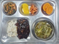 점심식단밥 : 자장덮밥국 : 얼갈이된장국반찬 1 : 야채비빔국수반찬 2 : 단무지반찬 3 : 감귤반찬 4 : 김치 ..
