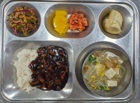 점심식단밥 : 짜장덮밥국 : 황태채무국반찬 1 : 야채비빔국수반찬 2 : 단무지반찬 3 : 바나나반찬 4 : 김..
