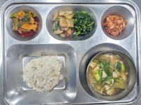 점심식단밥 : 쌀밥/잡곡밥국 : 고디국반찬 1 : 두부양념조림반찬 2 : 마늘종어묵채볶음반찬 3 : 치커리오이무침반찬 4 ..